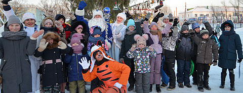 А Дед Мороз (Алексей Корнов) и Снегурочка (Анна Лило) принесли мешок с подарками для местной детворы. Тигрёнок Тигрыш-Крепыш (Егорий Хомяков) устраивал турниры по перетягиванию каната и катанию на санках. И, конечно же, все не испугавшиеся мороза водили хоровод вокруг ёлки, на которой зажглись яркие новогодние огоньки.