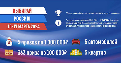 Прими участие в социальной акции ВЫБИРАЙ РОССИЮ. Участником может стать житель Омской области, достигший 18 лет. Для этого нужно 15, 16 и 17 марта прийти в здание, где располагается избирательный участок, заполнить купон у представителя организатора. 4 раза в день в прямом эфире 12 телеканала с помощью генератора случайных чисел будет проходить определение победителей. Акция проводится в рамках социального проекта «РОССИЯ – МОЯ СТРАНА». Период проведения акции с 22.01.2024 г - 19.04.2024 г. регулируется ст. 1055 ГК РФ. Количество призов ограничено. Определение победителей осуществляется 15-17 марта 2024 г. Организатором акции является Омский фонд РСП" Подробная информация об условиях акции на сайте https://vibirayrussia.ru