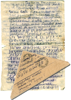 "Здравствуйте, дорогие родные! Посылаю вам сердечный привет и желаю всего наилучшего в жизни. Сегодня 26 декабря, получил от вас письмо. Сердечно благодарю. Сейчас, ночью, во время дежурства отвечаю. 18 декабря получил правительственную награду "За оборону Ленинграда". Поздравляю вас с Новым 1944 годом, тем годом, в котором мы должны вернуться домой. До скорой встречи!" (27 декабря 1943 г).