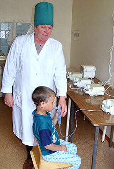 - У нас в основном пациенты поступают с патологией верхних дыхательных путей: бронхитами, трахеитами, бронхиальной астмой. Самое лучшее лечение для них - это ингаляционная терапия. Для этого у нас создана специальная ингаляторная, где размещено 7 небулайзеров. Далеко не каждая районная больница может похвастаться таким богатством. А вот видите, дверь с "ежиком", это и есть наша ингаляторная. Хотите заглянуть?