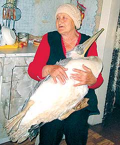 Женщина взволнованным голосом рассказала, что 1 октября, выйдя за ограду, обнаружила сидящего рядом с забором пеликана. Он был либо болен, либо ранен. Взять его на руки не получилось, так как он этому агрессивно сопротивлялся. А попытавшись взлететь, тут же камнем упал на землю. Лишь вместе с соседом удалось справиться с неуступчивостью пеликана: набросив на него покрывало, занесли в сарай.  Всю неделю Наталья Максимовна ухаживала за птицей: кормила рыбой, пшеницей, хлебом, наливала свежей воды. Пеликан заботу принял. Но сердобольную женщину мучил вопрос: что же дальше? Скоро зима, в сарайке холодно, птица может погибнуть. Позвонила в ветстанцию. Ей ответили, что ветуслуги диким птицам не оказывают, посоветовали выпустить пеликана на волю. «Как выпустить, - возмущается Наталья Максимовна, - его, такого беспомощного, тут же собаки разорвут!»  подробнее...