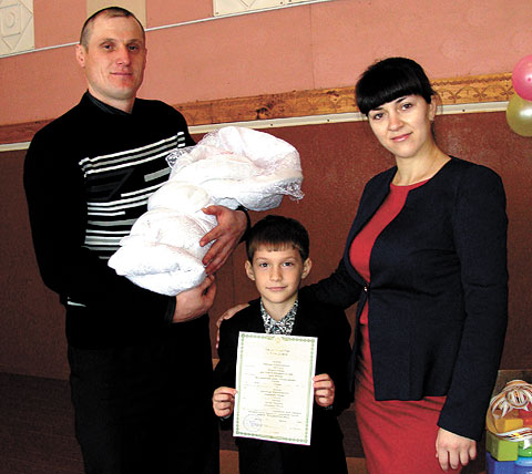 И вот уже 21 января в Князевском Доме культуры состоялась торжественная регистрация рождения Вареньки Косенок. В соответствии с семейным кодексом Российской Федерации, советник по Называевскому району Управления ЗАГС Любовь Юрченко пригласила счастливых родителей поставить подпись в записи акта о рождении, после чего вручила Александру и Оксане первый документ их дочери – свидетельство о рождении.
