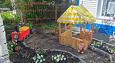 Расположенный в Называевске на улице Мира детский сад №2 как магнитом притягивает взгляды прохожих. Здесь возле фасада здания появились настоящие сказочные полянки.