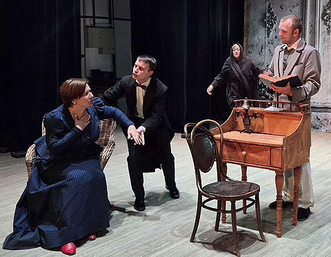 Всё это действо разворачивается на фоне декораций гостиной помещецкой усадьбы, где один за другим появляются герои спектакля. Зрителю являются персонажи, предлагаются загадки, доверяются тайны. Вот мы наблюдаем за эмоциональным разговором Меропии Давыдовны и Аполлона, в ходе которого впервые коварный замысел обретает словесные очертания. Вот внимаем монологу экономки Павлины Савельичны (Татьяна Чернова), который позволяет зрителю «заглянуть» в закулисье жизни в усадьбе Мурзавецких. Здесь также проживает родственница помещицы, бедная девица Глафира Алексеевна (Ольга Вагнер). Она якобы готовится принять монашеский сан, но в тайне вынашивает хитроумный план – женить на себе богатого барина Михаила Борисовича Лыняева (Владимир Рушев).