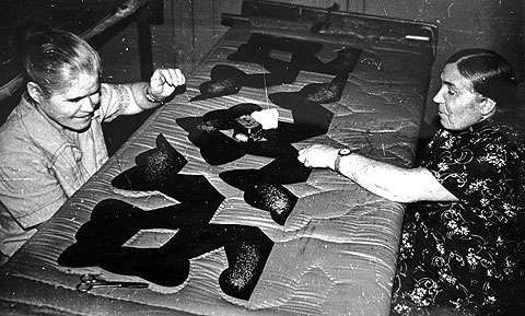 Одеяльщицы – Анна (фамилию уж не припомню) и глухонемая Галя Иваненко настилали, а мы прошивали. Сначала готовую основу сшивали со всех 4-х сторон. Затем по лекалам, вырезанным из плотного картона, мы вручную прошивали вдоль всего одеяла. Затем обратная сторона. Дорожки шили по такому же методу. После готовые изделия отправлялись заказчикам.