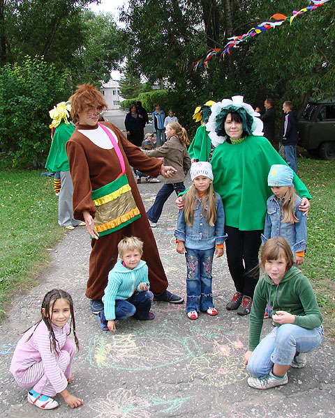 А для ребятишек в это время проводилась театрализованная игровая программа "Цветочный хоровод". Специалисты районного Дома культуры, переодетые в персонажей известных мультфильмов: медведь Винни-Пух, пчела Майя, а также цветы Подсолнух, Ромашка и Одуванчик забавляли ребят различными играми, загадками, соревнованиями, эстафетами, кружили хороводы. Удался и конкурс рисунка на асфальте "Веселые краски лета", где малышей за их красочное творчество наградили альбомами и разноцветными карандашами.