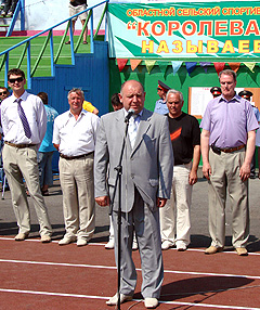 «Дорогие друзья, гостеприимные называевцы, доблестные сельские спортсмены и организаторы праздника, - обращается к присутствующим первый заместитель министра по делам молодежи, физической культуры и спорта, заместитель председателя оргкомитета праздника Виктор Бабкин, - мы еще раз убеждаемся, что наша Королева спорта - это самое яркое, самое насыщенное событие такого короткого сибирского лета. Но самое главное, что такие праздники оставляют прекрасные спортивные объекты, как, например, в Шербакуле, Кормиловке, Исилькуле, Калачинске и вот, в Называевске. Я уверен, что та спортивная база, которая получена в подарок благодаря Губернаторской программе здесь в Называевском районе также будет воспитывать новых чемпионов. Благодаря всей работе, в труде и в любви мы с вами сумели так подготовиться, что в последние годы омские сельские спортсмены одни из сильнейших в России. И поэтому, дорогие друзья, любите спорт».